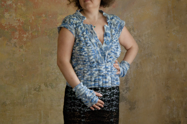 Śliczny komplecik sweterek i mitenki. Ciepła, gruba, melanżowa włóczka sprawi, że niestraszne nam będą zimne jesienne dni. Rozmiar: 38